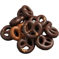 Caramel-coated pretzels are a sweet-and-salty snack combining a crunchy baked pretzel base with a rich, buttery caramel layer. This confectionery treat balances the pretzel's characteristic saltiness with caramel's sweetness, creating contrasting textures of crisp dough and chewy coating. While providing quick energy from refined carbohydrates, they tend to be high in added sugars and sodium compared to plain pretzel varieties. The snack is commonly enjoyed on its own or used as a dessert garnish, with some versions incorporating additional layers like chocolate or nuts.